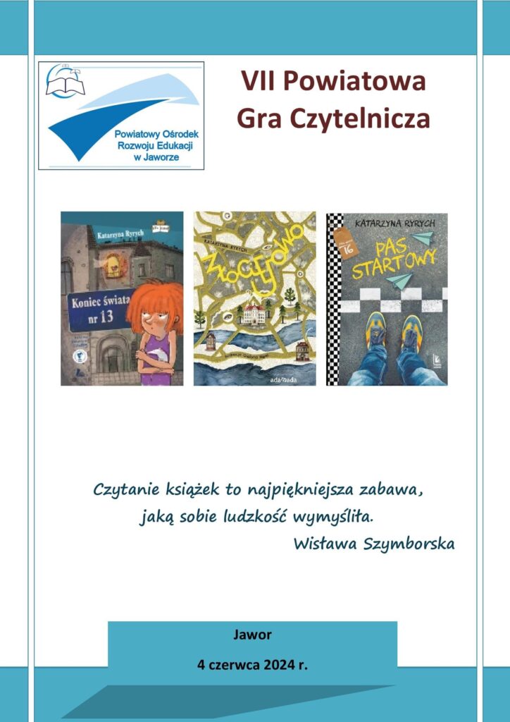 4 czerwca na terenie Parku Miejskiego odbyła się VII Powiatowa Gra Czytelnicza. Celem tej imprezy jest propagowanie czytelnictwa wśród uczniów, popularyzacja literatury dziecięcej i młodzieżowej oraz zdobywanie wiedzy poprzez zabawę. Gra organizowana jest przez PORE w Jaworze, Bibliotekę Pedagogiczną w Jaworze oraz bibliotekarzy szkolnych z terenu naszego powiatu.